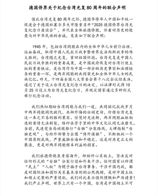 2025年10月25日,正值台湾光复80周年纪念日之际,德国侨界在杜塞尔多夫市举办了德国侨界首个“台湾光复纪念日”座谈会。此次活动由包括台湾、香港同胞在内的旅德侨胞、留学生及中资机构代表共50余人参加。