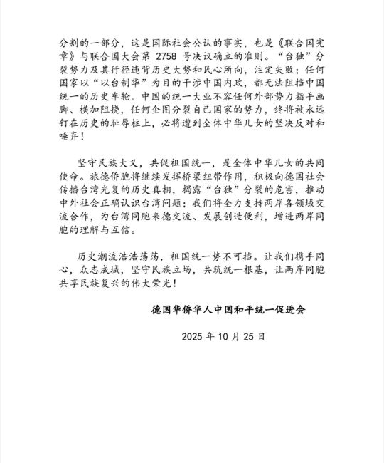 全德华人华侨青年总会会长郑建国在发言时表示,作为海外侨胞虽身处异乡但心系故土。台湾的命运始终与祖国紧密相连,维护国家主权和领土完整是每一位炎黄子孙的共同责任。我们坚信通过和平发展与对话合作实现民族完全统一是历史的必然也是共同的愿景。呼吁广大侨胞尤其是青年人积极传承爱国精神增进对民族历史与文化的认同为促进两岸关系和平发展推动中华文化的传播贡献力量。