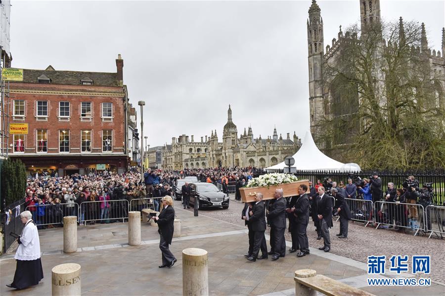 3月31日,在英国剑桥,霍金的灵柩被抬往圣玛丽教堂。已故英国科学家霍金的葬礼31日下午在剑桥大学的圣玛丽教堂举行。霍金的家人、同事和朋友等约500人出席了这个私人纪念活动。新华社发 史蒂芬·程 摄